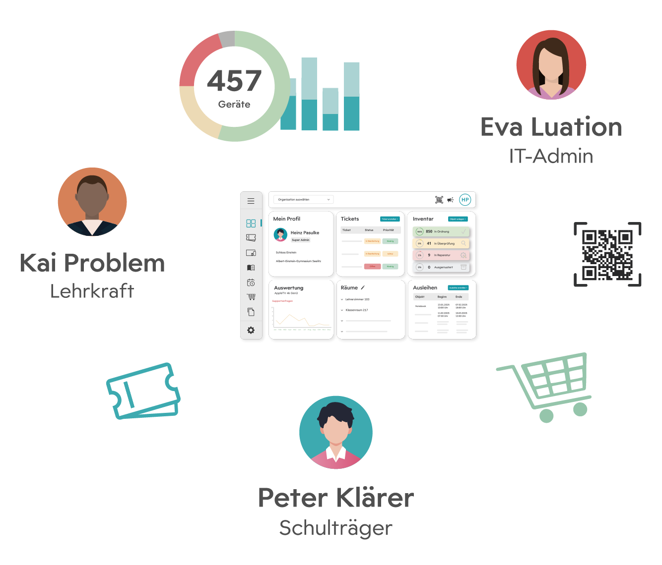 Inventarisieren, Störungen melden, Räume verwalten, Ausleihen koordinieren, Dokumente speichern, Lehrende schulen, Service-Termine koordinieren, Folge- und Wiederbeschaffung planen – alles in einer Software.