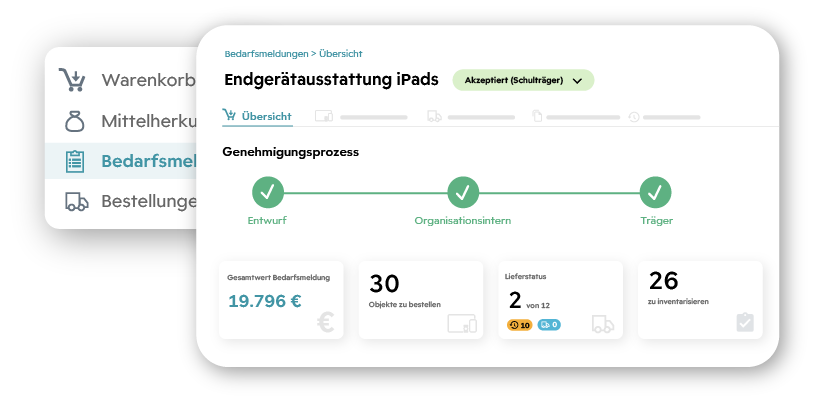 Schulen melden Bedarfe direkt aus dem Warenkorb oder als Freitext-Bedarf mit Begründung. Alle Meldungen laufen zentral beim Schulträger ein, der sie prüfen, anpassen und bei Rückfragen direkt mit der Schule kommunizieren kann. Mehrere Bedarfe lassen sich bündeln, um Bestellungen effizient zu planen.